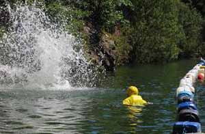 First of a series of weird view shots of people going down The Zip, our awesome zip wire (it’s the longest, highest and fastest in the UK!). Check out this unusual shot of two otherwise normal members of the public going over the photographer's head at 40mph. This snap was taken from the safety boat in the middle of the Adrenalin Quarry lake.